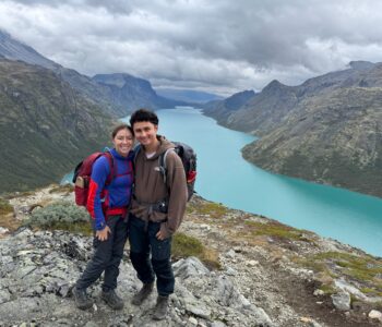 We slept decently well last night, but it was a little noisy being right next to the bathrooms. The linens were also very warm, and it was hard to leave the comfort of bed. This was the first day of our actual trek and we woke up at 8:00 AM to eat breakfast and pack lunch. Breakfast was more like a buffet and had a variety of meats, cheese, oatmeal, pastries, and yogurt. For lunch, you get 4 slices of bread to basically make two sandwiches using the meats, cheese, and spreads out for breakfast. We packed ours in a paper bag they provided, then checked out around 9:00 AM and headed on our way. We were heading to Gjendebu which was about 10.5 miles away. It was very easy to stay on trail through town as long as you kept your eye out for the signs, which were very well marked. The first three miles were very flat and very muddy, but maintained well with boards to keep the trail somewhat dry. The trail became slightly harder to follow, but there were plenty of cairns and Alltrails was pretty accurate. The trail is also along the lake or slightly above it for most of the time, which makes for a good reference point. Finally we split off from the main trail to head up into the mountains. The hike became pretty steep here – about 700 ft up in a mile – until we reached the top of the plateau. This was where we ate our first sandwich before continuing along the route. Turns out, that was the bulk of our elevation gain and the rest of the hike was a relatively mild uphill. Reaching the top of that incline threw us into the main park and we headed deeper into it for the remainder of the route. It was absolutely stunning back there and we saw so many glaciers, lakes, and peaks. The terrain was very alpine, with no trees and very durable plants. Once we were up there, the plateau felt more like a valley surrounded by many mountains than the top of somewhere we had just come from.